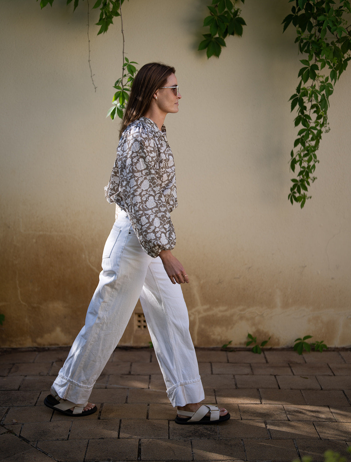 The Divya Blouse in Jaisalmer Stone is crafted from fine cotton cambric — a lightweight yet structured fabric known for its smooth handfeel and subtle drape. Designed to hang effortlessly from the body, it features a refined stand neckline, long voluminous sleeves with elasticated cuffs, and hand-stitched fabric-covered buttons through the front. A longline silhouette with a gently curved hem falls slightly longer at the back, creating an easy balance of elegance and ease.